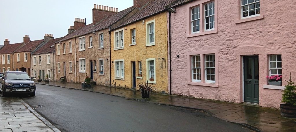 West Wemyss was every bit as beautiful as I’d hoped. Stone walls took the narrow road down to the seaside village, where all was so quiet we wondered where everyone was! Not a dog or cat to be seen, no music or walkers; even the sea was so smooth it appeared to be holding it’s breath in the har. (Yes that’s a new word for me too…. sea mist).