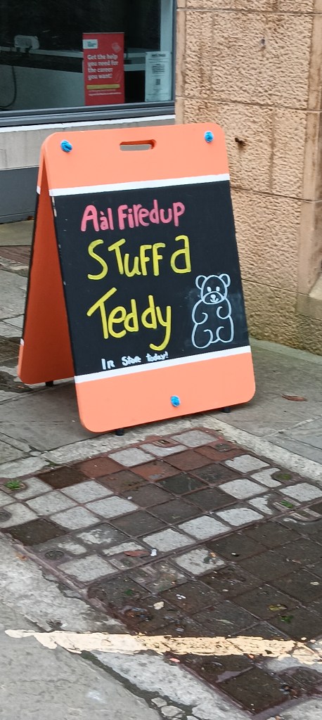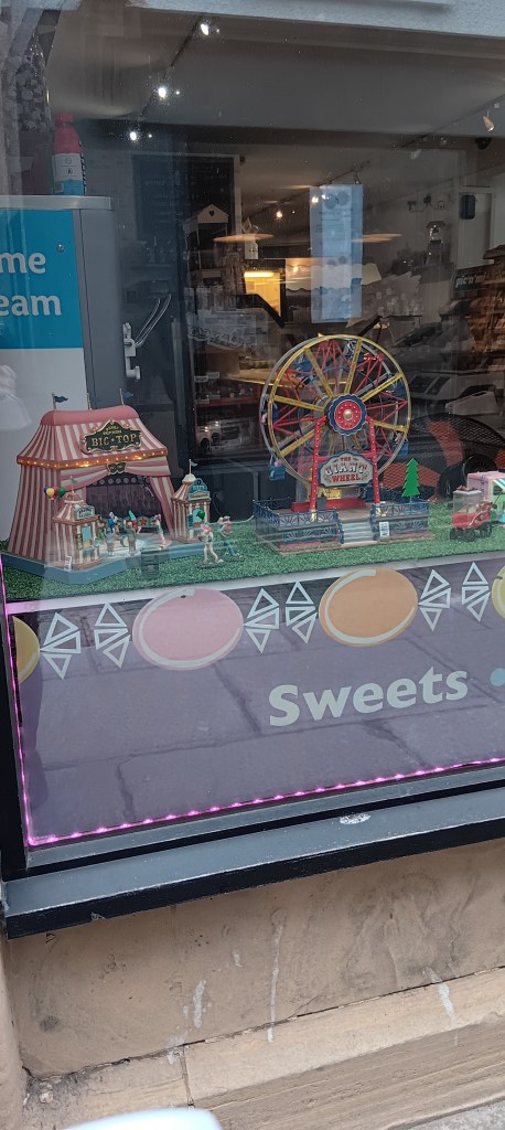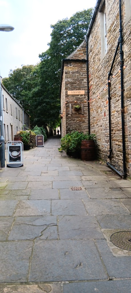 Kirkwall’s main street offered teddy stuffing, and shop windows full of treats, in fibre, food and whiskey, or jewelry. The ‘Just slate’ company sold glass and silver jewelry but no slate. A thin, purple-haired busker in scrunched pink socks, red lipstick, gypsy vest, 1/2 trousers, mouth organ and guitar was walking the streets of London, according to the song. Two hours later he was walking those same streets. And half an hour after that he was walking them again…