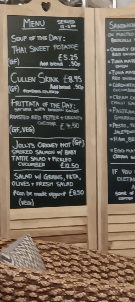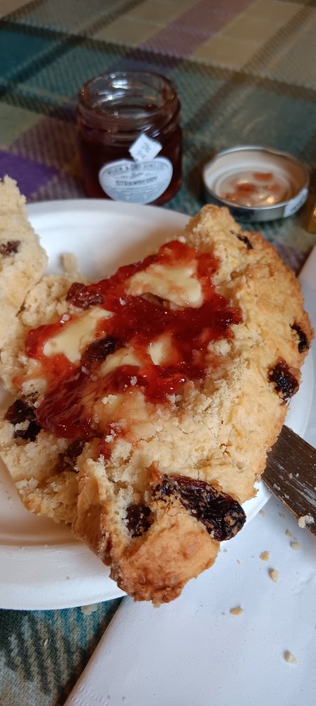 Up a cobbled side alley, Lolz Cafe beckoned. Cash only, seats 16, with a mother-daughter team welcoming customers as old friends (most were), serving perfectly crumbly scones, Cullen skink and other tasty treats. The scone comes with a wee jar of jam to keep. Having never heard of Cullen skink, I tried it. Large pieces of fresh fish and potato in thick creamy broth, served with slabs of fresh bread; absolutely delicious.