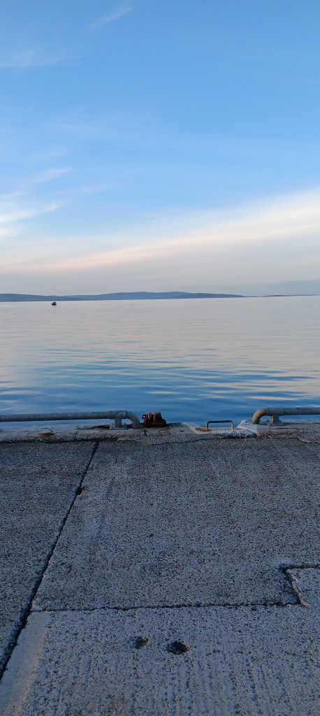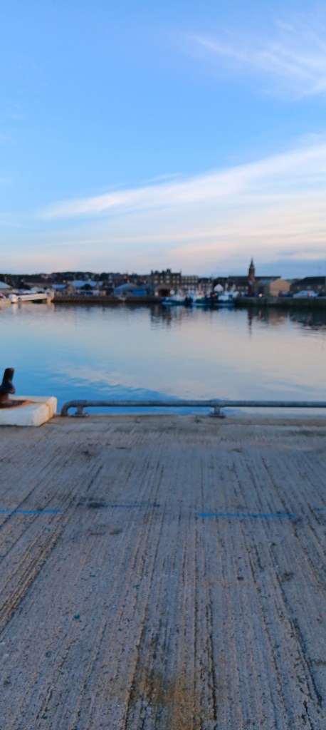 Just on dusk Kirkwall pier was pretty deserted. A notice to fishermen about a scheme for plastic and other rubbish caught in nets mentioned fishermen’s kisses. In a nearby office, the three maritime personnel I queried about fishermen’s kisses were generous enough not to lead me astray! Fishermen’s kisses are the knots in fishing nets. However the laugh was on the gents; not one of them had noticed the signs wording, and they came out to read it for themselves.