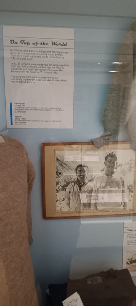 Exploring the exhibitions, around a corner and there was a photo of Tensing and Hilary. How could Shetland claim Everest success? But indeed they can; Shetland wool kept the two mountaineers warm. And not just that expedition; there are many famous adventures which were clothed in Shetland wool.