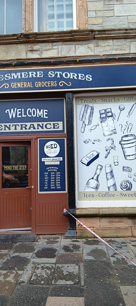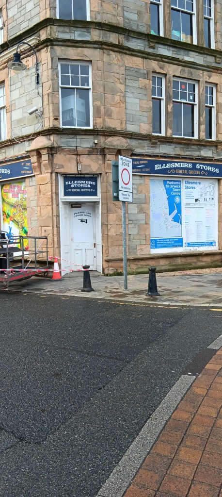 Lerwick celebrates it’s history with cannons guarding the esplanade from atop stone walls, and cobbled streets offering everything from the Red Cross shop, Boots the chemist and the inevitable chippie, through to everything wool and lovely cafes. One shop had me flummoxed… not this door, nor this one, and then only if you’ve ID. Made me wonder what was in there. Turned out it was an old-fashioned grocer with dark wood, narrow aisles, and a bit of everything.