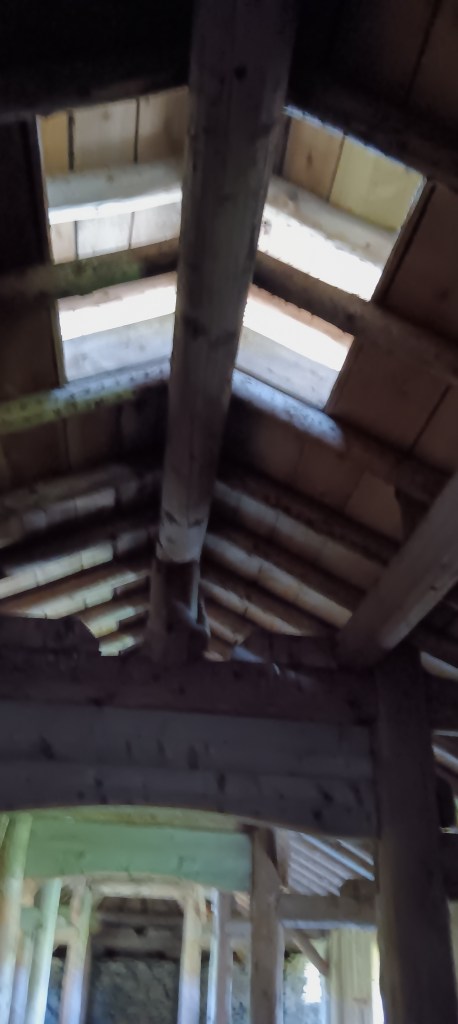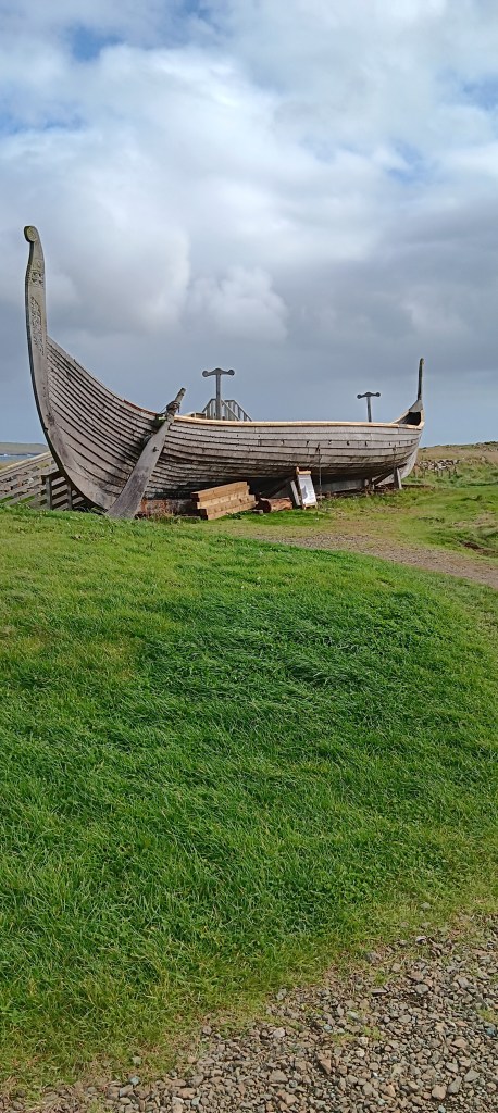 Across the bay, a viking long-house, and boat being restored. Note how the smoke could escape without the weather coming in. A side room held an incongruous stack of 1960’s hall chairs…