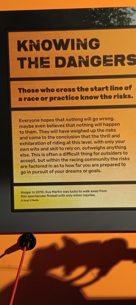 TT Isle of Man; men and women from all over the world come to race through narrow streets, over a mountain, and through stunning countryside. The island (and museum display below) counts down to the annual event….