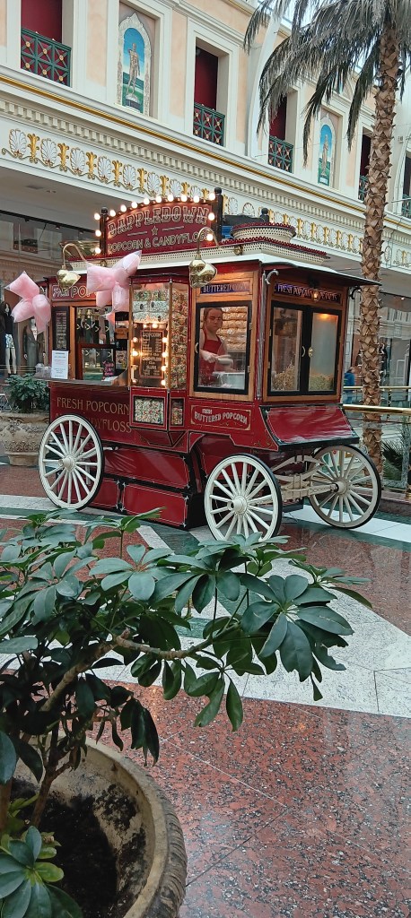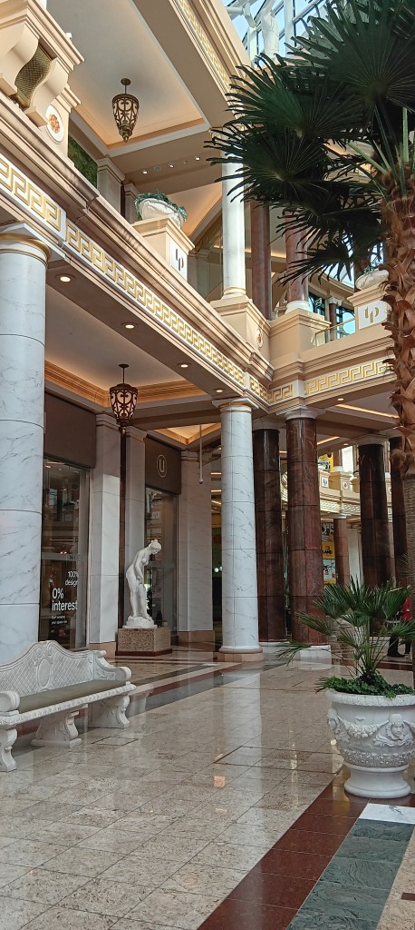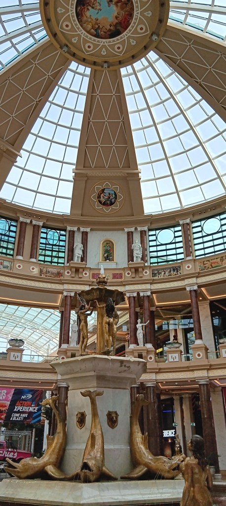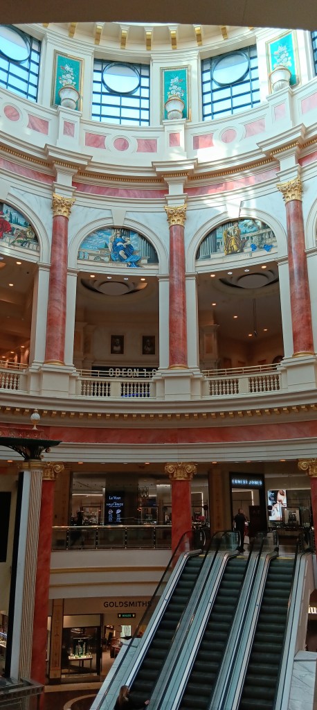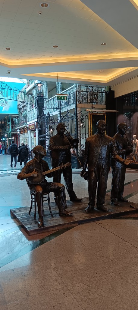 And then, upstairs, go past a statue of New Orleans musicians and into the two-storeyed French Quarter (remembering you’re already upstairs!). There’s a feeling of disorientation… a French street in an Italian Plaza, in a UK city mall. Makes perfect sense.