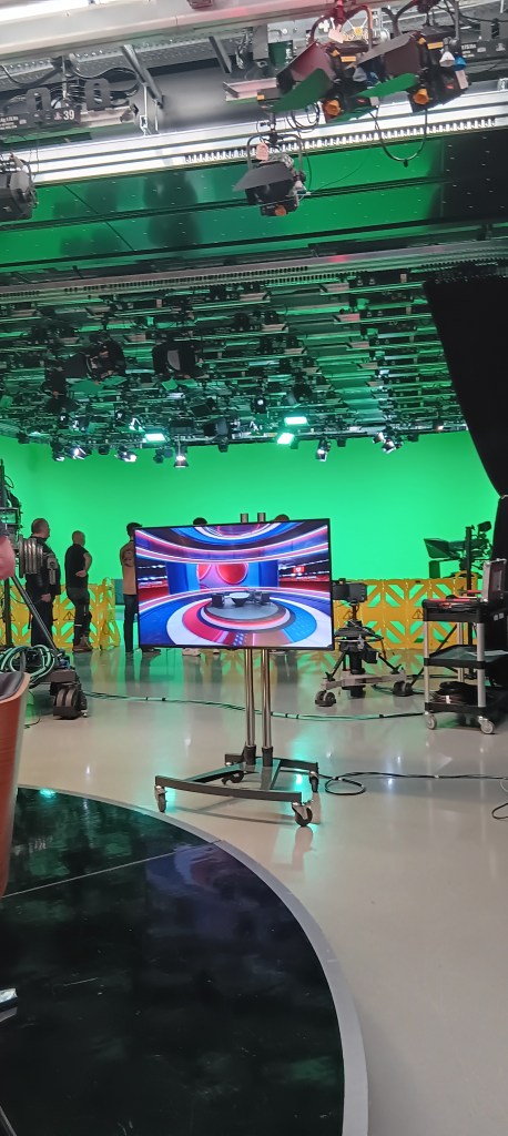 There’s so much which goes into a broadcast. Grading is the process of removing logos, making the sea more blue, etc. The studio for live shows is usually green, without all the colour we see on our screens. This photo shows the studio (behind the yellow fence. You can see one corner of a chair), with the foreground screen showing what we would be seeing at home if it was on air at that moment.