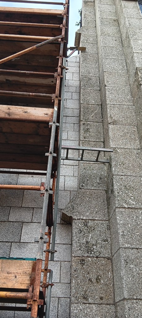 A church being insulated, involving removing exterior walls, adding layers, then rebuilding the stone!