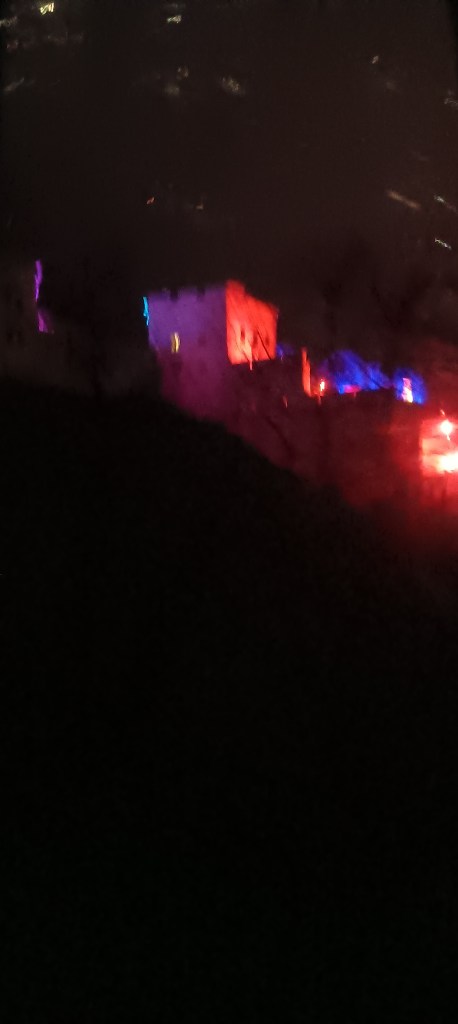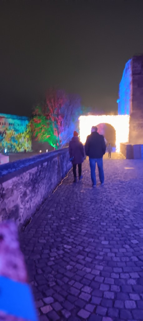 Another area, another theme. I wasn’t sure how witches with their shrill laughter fitted with Christmas, despite them signifying centuries-old stories. But then, through another alley to enjoy a wall of dancing light, where small boys could sit on their father’s shoulders and become huge shadow boys waving their arms to be ten meters tall.