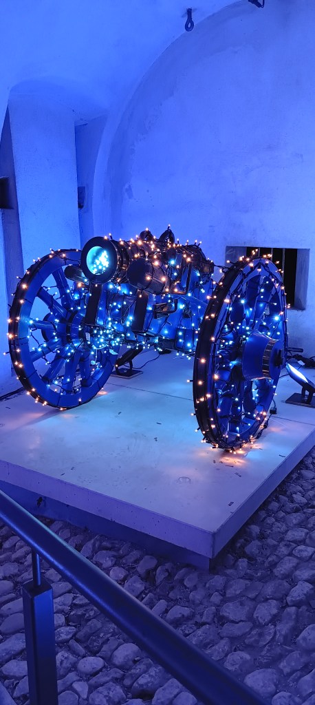 Inside arched tunnel-like areas, artifacts and history were interspersed with season-related items. I’m not sure how versions of the Madonna there are (no, not the singer) but this site has a good many, with some surprising guises. Clearly each creator had a differant image in their heads at the time of carving, though maybe some were restricted by orders, resources, and the desire to keep one’s skin.