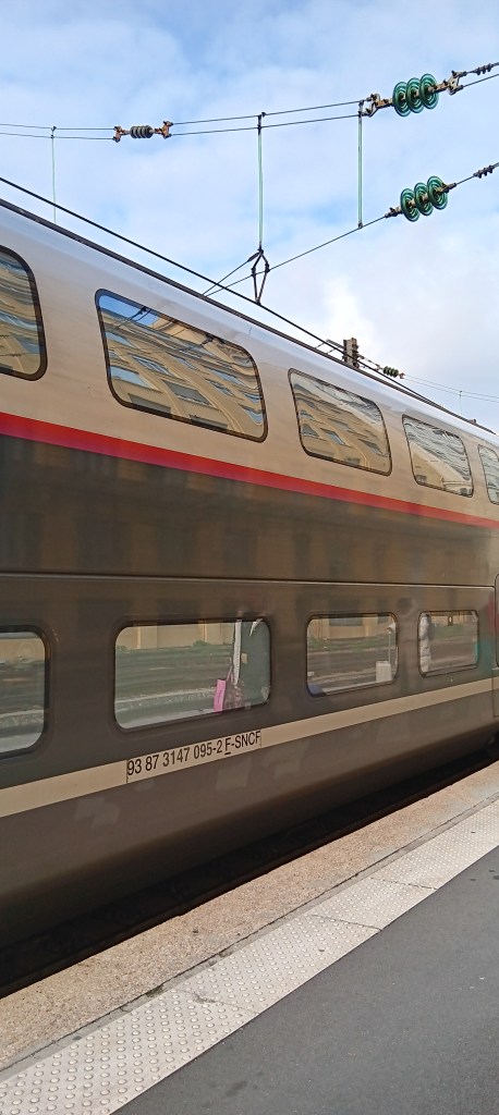 The train to Paris! 320km per hour! Faster than I’ve ever traveled across land. The tunnels bring pressure in the ears; not severe but enough to create awareness. Knowing the train finishes in Paris, I feel safe in taking an upstairs seat, from which the view is that much clearer.