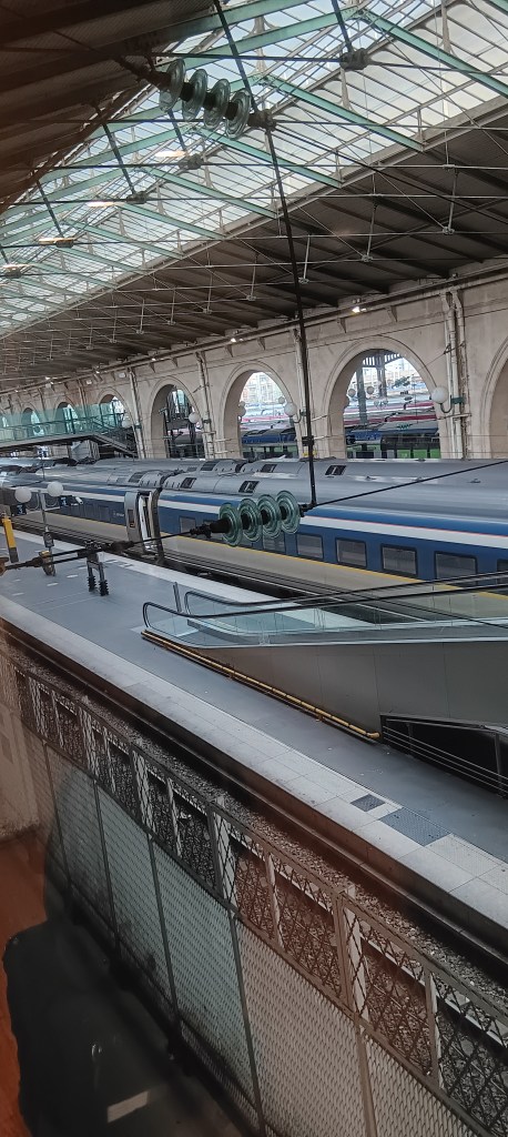 Just along from my seat is a small locked area, where a uniformed guard sits opposite a jovial 30-something obese man. I do not understand why the guard must lock the man in that tiny space when he goes for their food or drink. The ‘prisoner’ is writing a letter on his laptop, for which he gets advice from the guard. They are friendly to each other, and as the journey continues they relax more. By the time we reach Paris, the ‘prisoner’ is free to leave the train on his own. The guard wishes him well, and shakes his hand. What was that all about? A deportation perhaps?